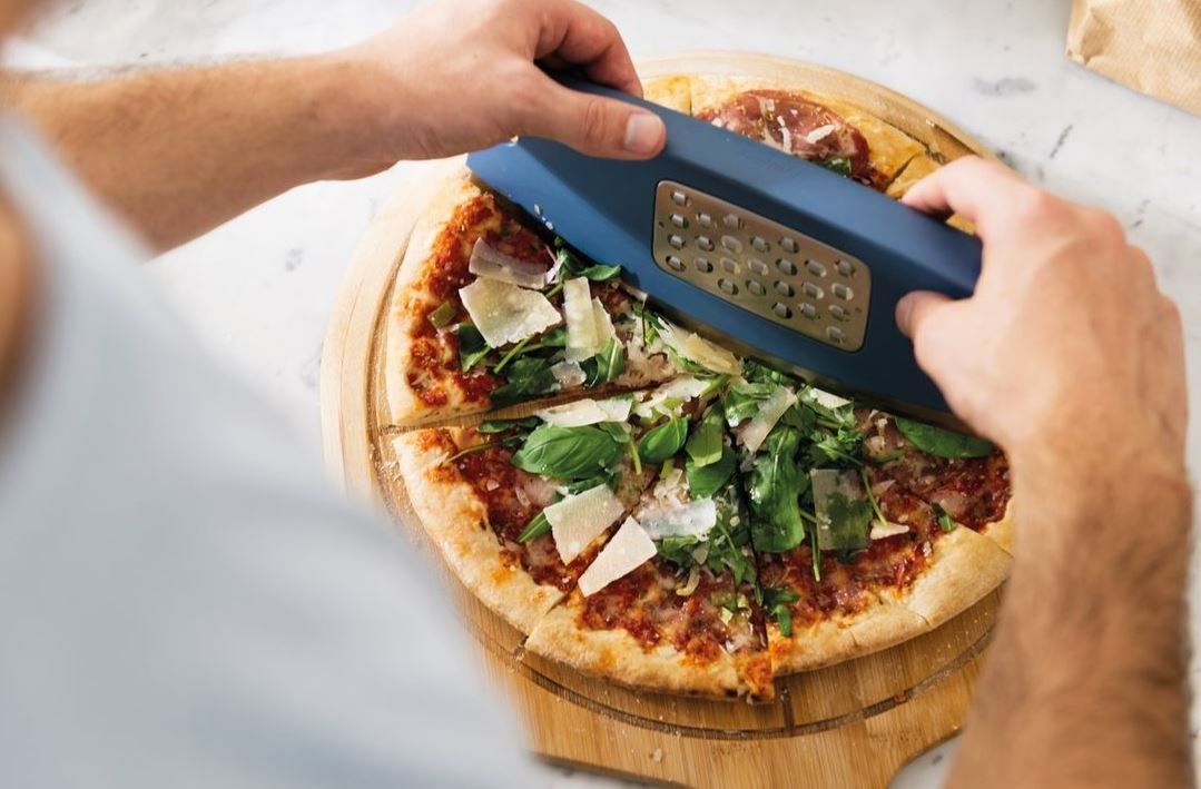 Deze multifunctionele pizzasnijder & rasp krijgt een dikke duim van elke pizzaliefhebber! Dankzij het ingenieuze ontwerp rasp je eenvoudig verse Parmezaanse kaas bovenop je favoriete toppings en snijd je vervolgens de pizza snel in stukken met het roestvrijstalen mes. Pizza met een dunne of dikke korst, dit scherpe mes kan het allemaal aan en snijdt keer op keer perfecte porties.
